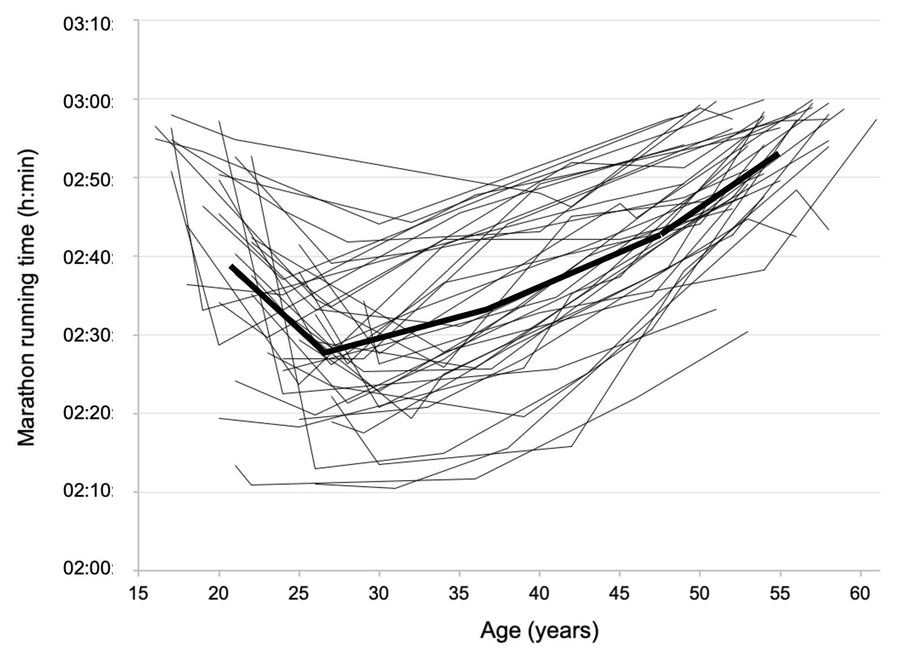 A study in the Frontiers of Physiology analyzed 40 runners who have run sub-3 hour marathons in 5 consecutive decades.