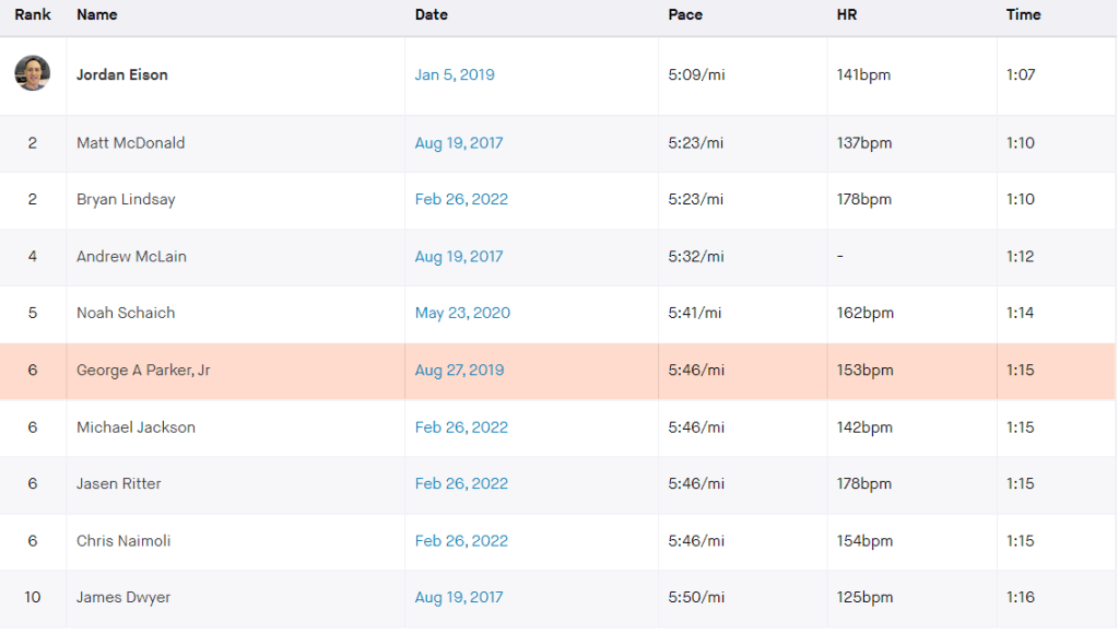 Mile 3 is where championships are won, and PRs are made. You will continue rolling over hills for the first part of the mile. Once you pass the Coca-Cola Global Headquarters on your right, it’s time to go to work. A 400m hill climb on Luckie Street with a 4% grade is ahead. To me, this is the most testing part of the course that comes at a critical time when lactic acid is pumping through your legs. Below is the Strava Leaderboard for Top 10 times up Luckie Hill. That’s me tied for 6th place, but definitely, that time was not during a race. At race pace, this climb will be a +70 second effort at a hard rate as your body screams for relief.